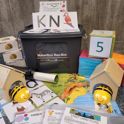 Bee-Bots sind kleine Lernroboter in Form einer Biene, die sich, über Richtungstasten auf der Oberseite, ganz einfach und intuitiv steuern lassen. Mit einer Abfolge von Befehlen wird der Bee-Bot auf einer Bodenmatte zu einem ausgewählten Ziel gesteuert. So können schon Kinder ab 4 Jahren auf spielerische Weise erste Programmiererfahrungen sammeln und ihr räumliches Denken und mathematisches Verständnis schulen.